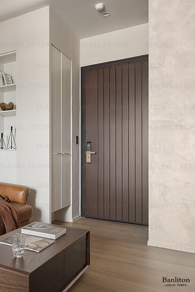 一進門右手邊,是座結合機能與美感的多功能鞋櫃。白橡木紋的門板延續公共空間的材質語彙,與牆面融為一體,維持乾淨俐落的立面線條。這樣的設計在視覺上放大了空間的開闊感。