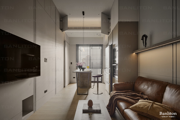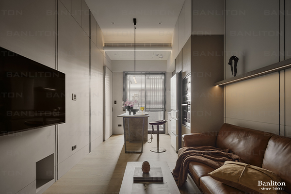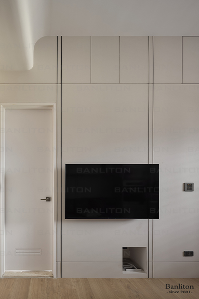 電視以壁掛形式呈現,下方木作櫃體則設計出可藏線的凹槽,用以放置影音設備。這樣的安排不僅釋放了走道動線,也讓整體畫面更俐落純粹,呈現出小宅中難得的開闊與秩序感。