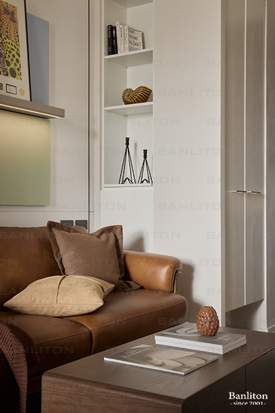 客廳牆面跳脫傳統油漆作法,改以具編織紋理的壁板打造出細緻層次。這種壁板除了可用濕布輕鬆清潔外,本身也是無毒、環保的綠建材,兼具美觀與實用性。透過壁板的收邊延伸設計,讓牆面一路向上銜接至天花板,不僅拉高了空間的垂直視覺感,也在結構中巧妙融入隱藏收納,兼顧整潔與機能。