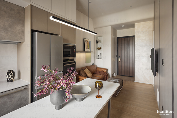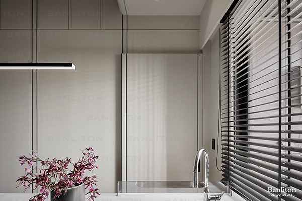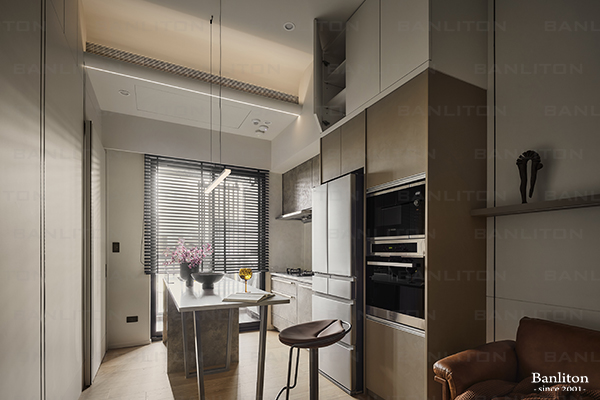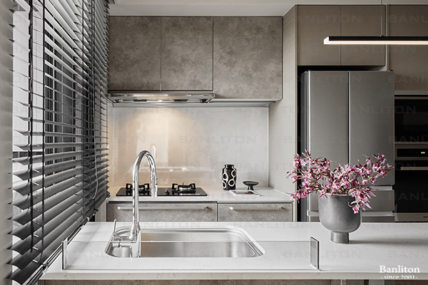 廚房中段牆面則選用日本進口抗菌防火壁板,不僅安全耐用,還為空間增添了層次與質感,讓日常烹飪的環境更具視覺焦點。