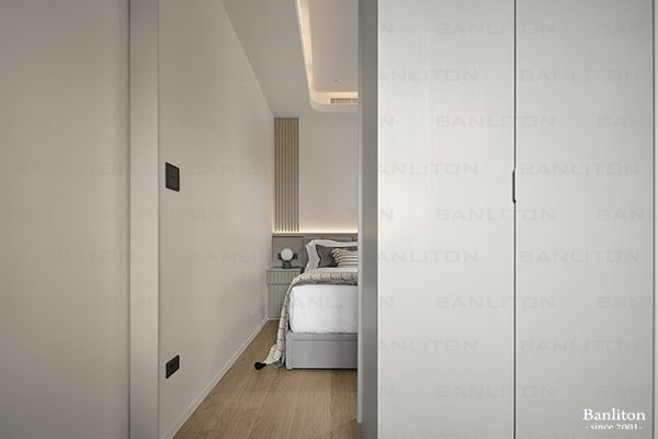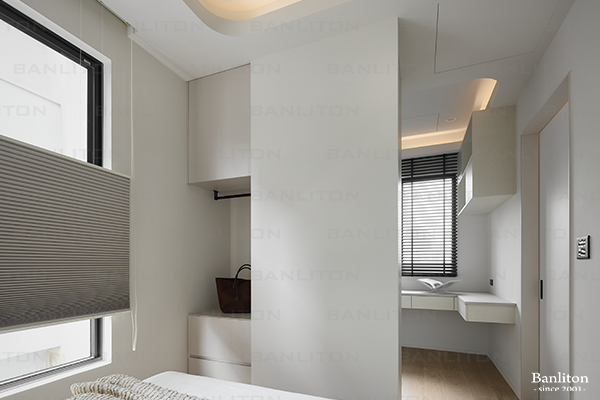 考量臥室本身為狹長型格局,設計上採用漂浮門作為出入口。利用分割設計使門片收邊與牆面齊平,讓線條自然延伸,減少了突兀的開口切割。視覺上更顯純淨流暢,同時保留了空間的完整性與一致性,呈現出一種簡約卻富層次的靜謐氛圍。