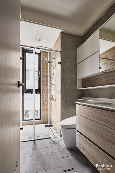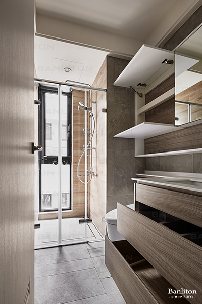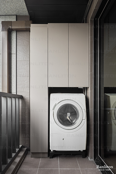 在陽台的規劃上,設計師盡可能讓每一寸空間都發揮最大效益,因此規劃了具收納功能的櫃體設計。由於陽台屬於半開放空間,考量到台灣多雨潮濕的氣候,櫃體特別選用防潮係數高的發泡板材製作,確保長期使用下仍能維持良好狀態。