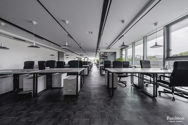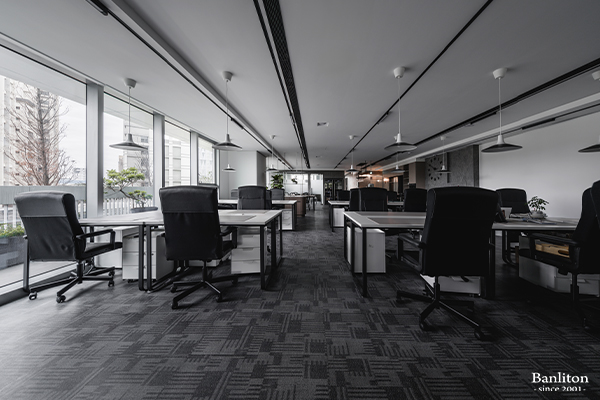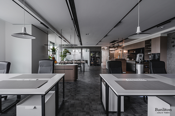 在核心辦公區,我們規劃了 54 個員工座位,並維持整體的通透與寬敞感。利用黑白色系的線條引導,讓視覺延伸,消除長形空間的壓迫感。
