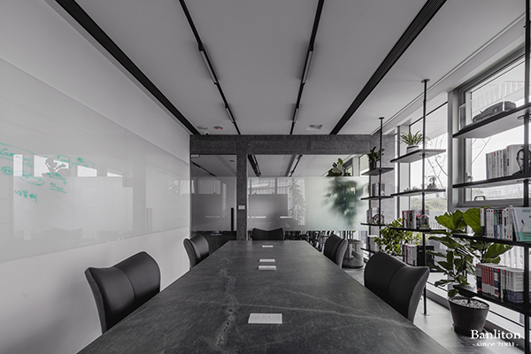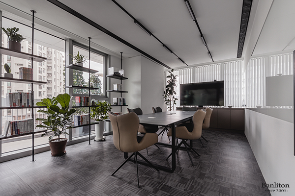 大會議室可容納 6-12 人,最亮眼的是那張 300×100 公分的客製化大板磚會議桌(這可是動用了吊車與六位大漢才搬進來的藝術品!)。牆面配置白色烤漆玻璃作為白板,並設有 75 吋大電視與視訊視角,方便與國際客戶對談。