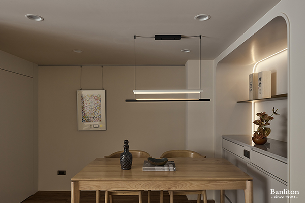 客廳背牆是公共空間的視覺焦點。為了避免大面積白牆帶來的單調與冷冽感,我們運用了特殊塗料創造出細膩的手感紋理,讓牆面在不同光影下呈現出豐富的表情。 設計上捨棄繁複的裝飾,改以弧形收邊來增加層次。這種「極簡但不冷淡」的手法,正是奶油風的精髓所在——用最純粹的色彩,堆疊出最耐看的質感。