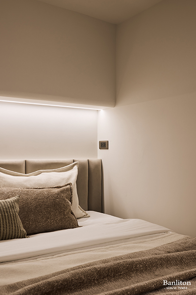 位於上層的主臥室,延續了公領域的溫柔色調。考量到夾層高度,床頭背牆採簡約設計,避免過度裝飾造成壓迫。溫潤的木地板與柔軟的寢具,營造出極致放鬆的睡眠環境。即使是在夾層空間,也能透過設計手法,享有不輸平面大宅的舒適度。