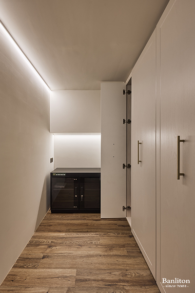 利用夾層空間規劃出的更衣室,絕對是女主人最愛的區域。拉伸式的掛衣桿搭配抽屜櫃,讓衣物收納一目了然。化妝桌旁的出風口是全熱交換設計,提供最完美的化妝環境。這裡不只是收納衣服的地方,更是展現個人品味的私密展演場。