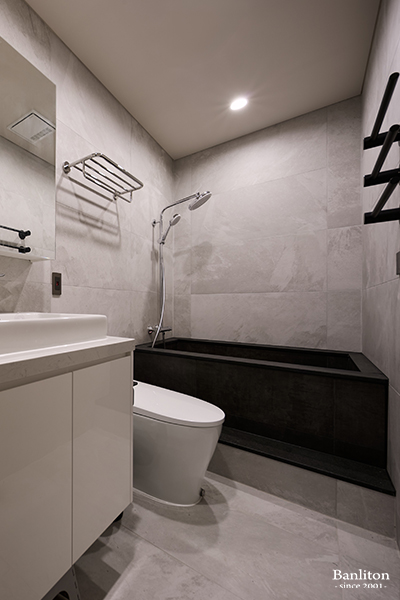 浴廁空間雖小,但細節絕不馬虎。牆面選用暖灰色的磁磚,營造出如頂級飯店般的氛圍。鏡櫃與浴櫃的設計增加了收納量,讓檯面隨時保持乾淨。搭配預埋式的電熱毛巾感,讓每天的沐浴時光都成為一種享受。