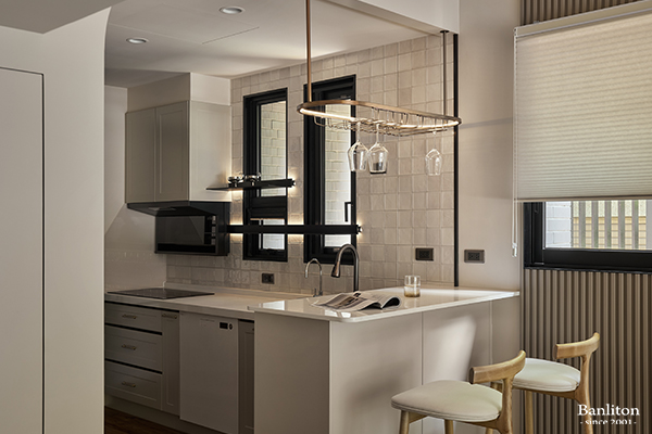 設計師精心打造了一座結合收納與用餐機能的輕食吧檯。檯面選用帶有石紋的材質,與奶油色櫃體形成優雅對比。這裡不僅是屋主用餐、小酌的角落,也是親友來訪時最輕鬆的交誼中心。後方的廚房採一字型配置,將洗滌、烹飪動線梳理得流暢順手。櫥櫃門片延續整體的奶茶色調,並將冰箱、電器櫃等大型家電整合收納,維持視覺的整潔俐落。即便是在做菜,也能透過吧檯與客廳的家人互動,讓料理時光不再孤單。