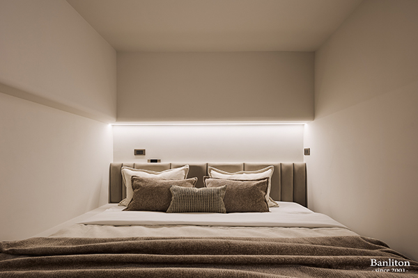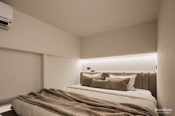 位於上層的主臥室,延續了公領域的溫柔色調。考量到夾層高度,床頭背牆採簡約設計,避免過度裝飾造成壓迫。溫潤的木地板與柔軟的寢具,營造出極致放鬆的睡眠環境。即使是在夾層空間,也能透過設計手法,享有不輸平面大宅的舒適度。