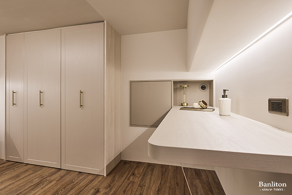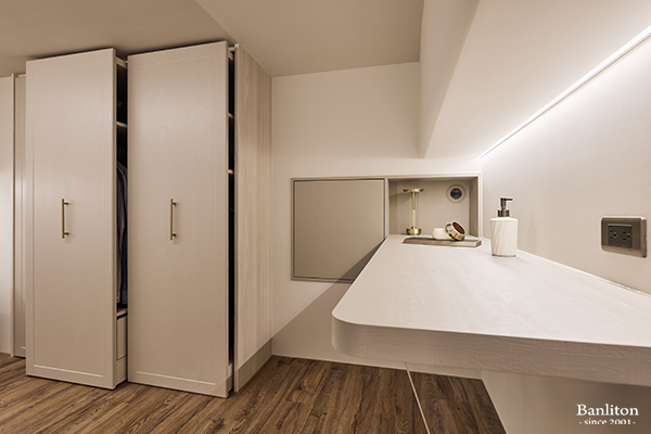 利用夾層空間規劃出的更衣室,絕對是女主人最愛的區域。拉伸式的掛衣桿搭配抽屜櫃,讓衣物收納一目了然。化妝桌旁的出風口是全熱交換設計,提供最完美的化妝環境。這裡不只是收納衣服的地方,更是展現個人品味的私密展演場。