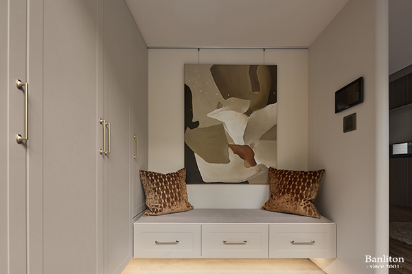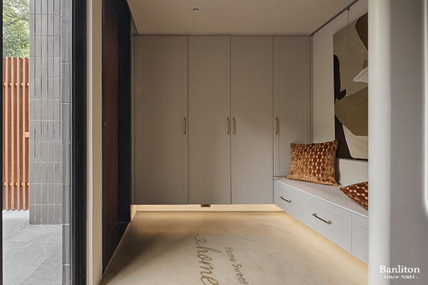 玄關不只是落塵區,更是轉換心境的過渡。一進門,映入眼簾的是與室內風格呼應的淺奶茶色系鞋櫃。考量到收納需求,我們規劃了頂天立地的櫃體,滿足屋主的鞋履與外出用品收納。地板選用微水泥的材質,並且提前預埋了銅標誌的設計與室內木地板做出區隔。在燈光的投射下,玄關顯得明亮而溫馨,搭配金屬把手的點綴,在細節處悄悄透露出輕奢的質感,讓人一進門就感受到家的精緻與放鬆。
