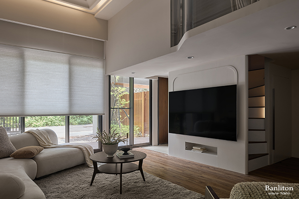 採光是小宅放大的關鍵。在客廳窗戶的規劃上,我們選用了透光性佳的調光簾,讓自然光能柔和地灑落室內,與奶油色的空間相互輝映,營造出明亮通透的視覺效果。